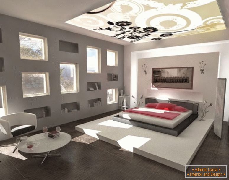 Najčešće, čak iu malim sobama, krevet se nalazi u sredini sobe, prilagođavajući ostatak interijera za to. Mali prostori ne mogu biti opterećeni teškim namještajem, ograničenim na neprimjetan ugrađeni sustav za pohranu i lagani stol za presvlačenje ili noćni ormarić.