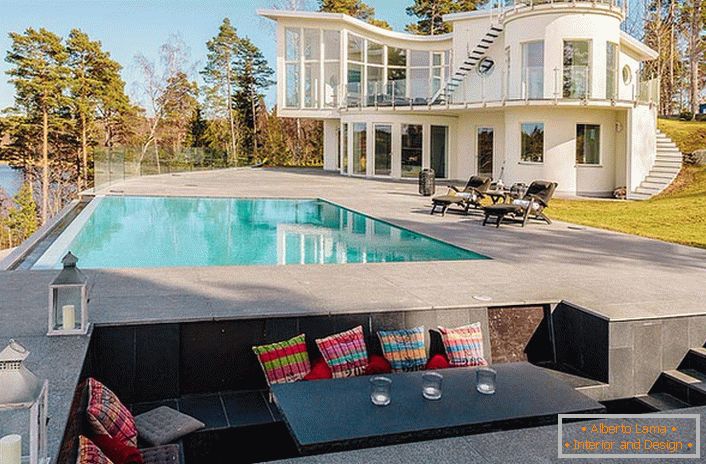 Dizajner je vizualno proširio unutarnji prostor, točno postavio naglaske u kući uz pomoć širokih prozora, bijelih drvenih podova i panela, kao i elemenata čelične dorade.