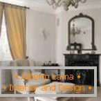 U dizajnu se ne može bez prirodnih materijala - drva, mramora, kamena, ili njihova kvalitetna imitacija. Za podnu oblogu koristite parket, laminat, pločicu s točnim obrascima. Na stropu se često nalazi ručna štukatura.